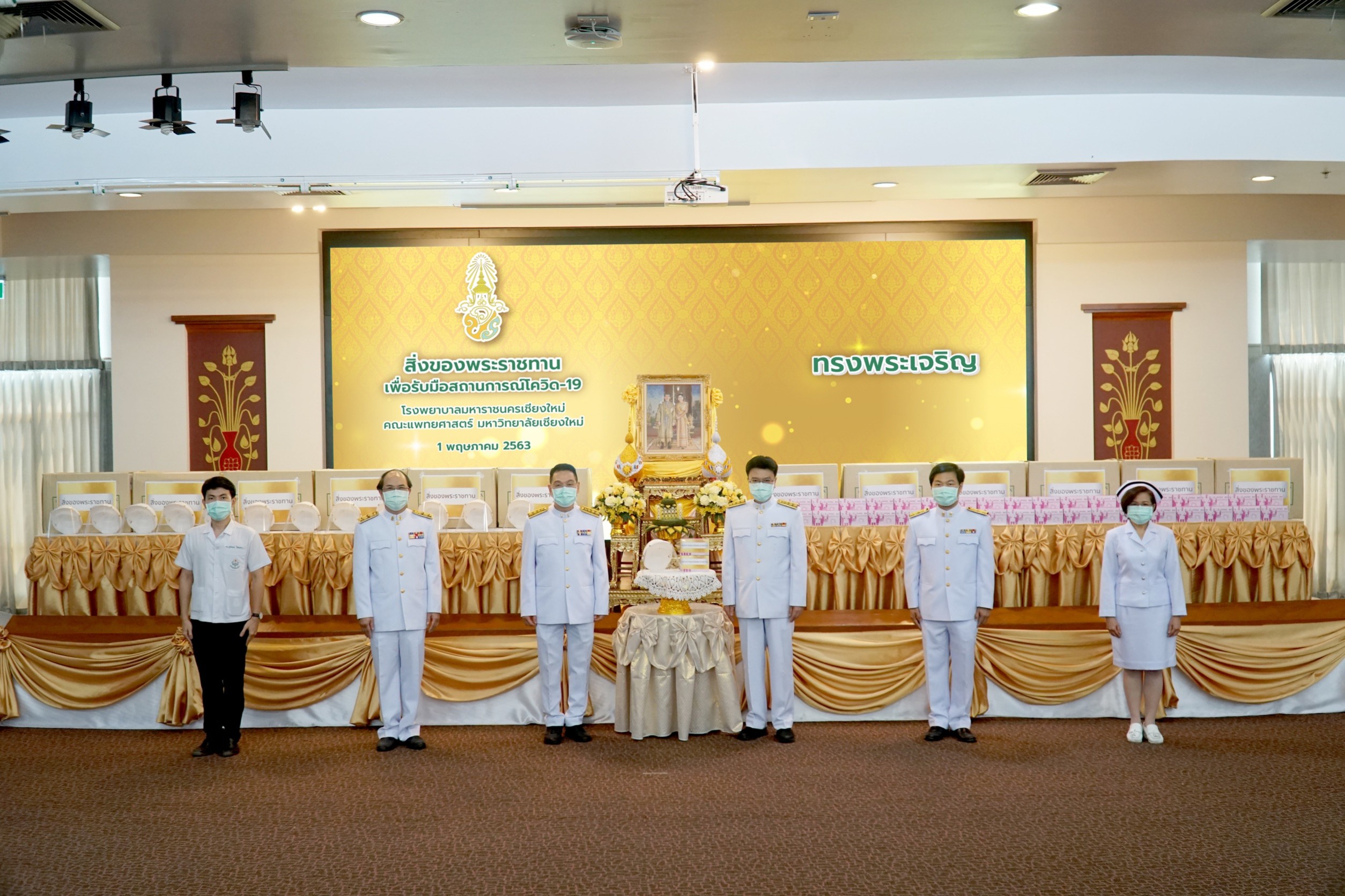 ในการนี้ ศ.นพ.บรรณกิจ โลจนาภิวัฒน์ คณบดีคณะแพทยศาสตร์ มหาวิทยาลัยเชียงใหม่ รศ.นพ.ชัยวัฒน์ บำรุงกิจ ผู้อำนวยการโรงพยาบาลมหาราชนครเชียงใหม่ รศ.นพ.อรรถวุฒิ ดีสมโชค รองคณบดีคณะแพทยศาสตร์ มหาวิทยาลัยเชียงใหม่ ผศ.นพ.สิทธิชา สิริอารีย์ รองผู้อำนวยการโรงพยาบาลมหาราชนครเชียงใหม่ ดร.หรรษา เทียนทอง รองผู้อำนวยการและหัวหน้าฝ่ายการพยาบาล โรงพยาบาลมหาราชนครเชียงใหม่ และตัวแทนแพทย์ประจำบ้าน โรงพยาบาลมหาราชนครเชียงใหม่ เป็นผู้แทนเข้ารับพระราชทานเวชภัณฑ์ทางการแพทย์หน้ากากอนามัย (Surgical Mask) และ หมวกป้องกันใบหน้า ( Face Shield ) เพื่อส่งมอบแก่บุคลากรทางการแพทย์ โรงพยาบาลมหาราชนครเชียงใหม่ เพื่อใช้ในการปฏิบัติงานต่อไป เมื่อวันที่ 1 พฤษภาคม 2563 ณ ห้องประชุม ชั้น 15 อาคารเฉลิมพระบารมี คณะแพทยศาสตร์ มหาวิทยาลัยเชียงใหม่